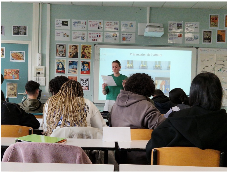 Pour mobiliser les élèves, les intervenant ont commencé par une activité nuage de mots et un quiz pour leur permettre de prendre confiance dans leurs connaissances acquises en classe. Après cet échauffement, nous avons pu passer au procès fictif. Les intervenants ont d’abord présenté l’affaire, et expliqué le rôle des différents acteurs au sein de la cour. Ils ont précisé l’ordre des prises de paroles, et expliqué le déroulement de la suite de l’atelier. Puis ils ont revêtu leurs robes et leurs bavoirs, et nous ont offert a plaidoirie de la partie civile, le réquisitoire du procureur, et la plaidoirie de la défense. Puis les dossiers des pièces à conviction ont été distribués aux élèves.